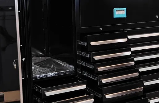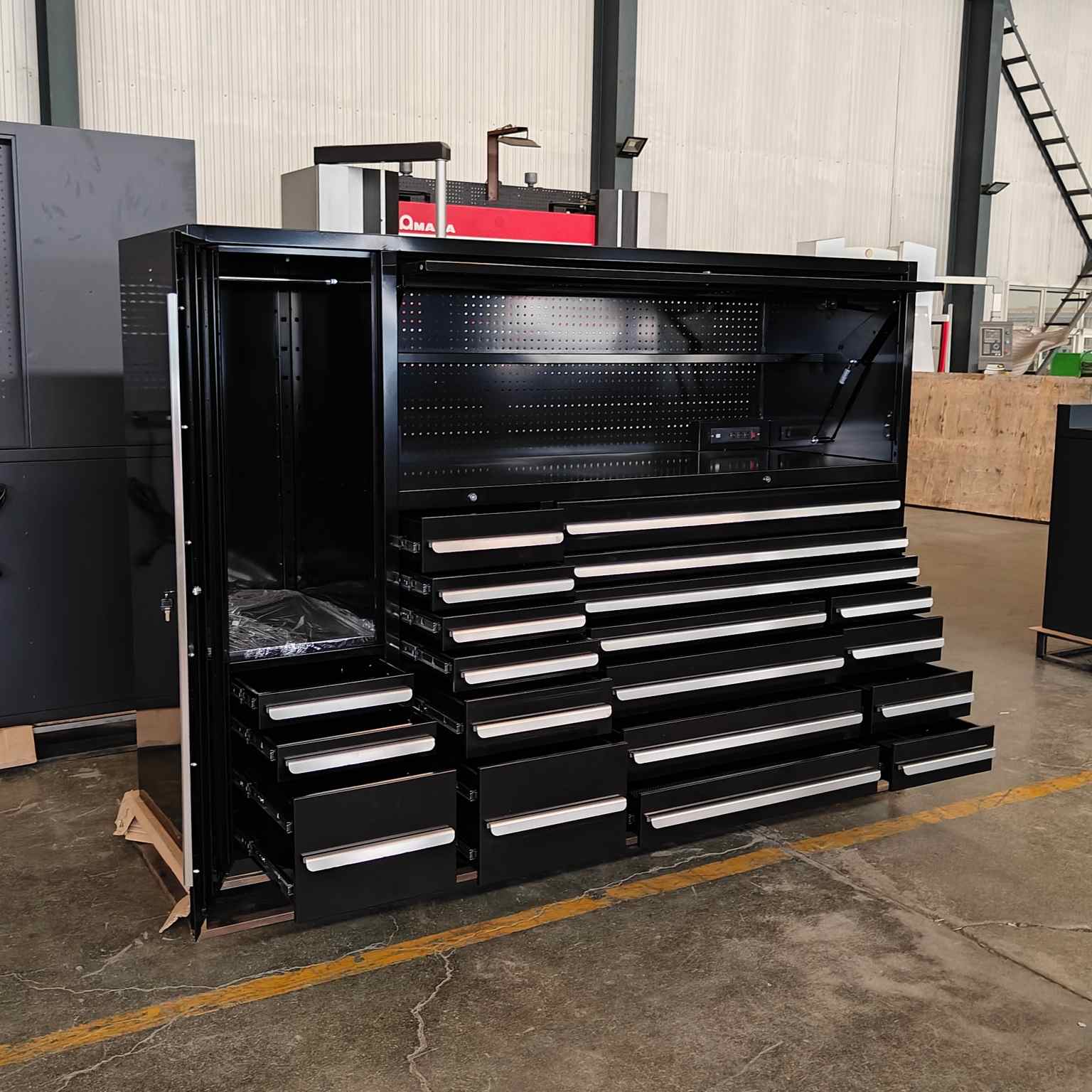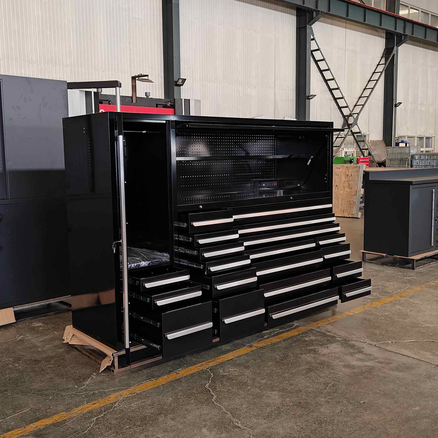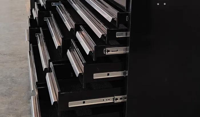 Үнсіз слайд рельстері: Қара көп функционалды құрал кабинетінде тегіс тартылатын рельстер бар, тегіс тартқыш және берік жүктеме сыйымдылығы бар.